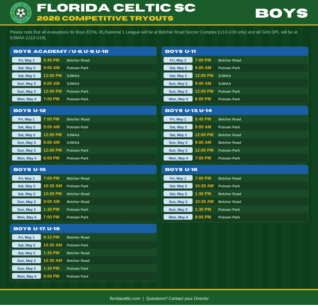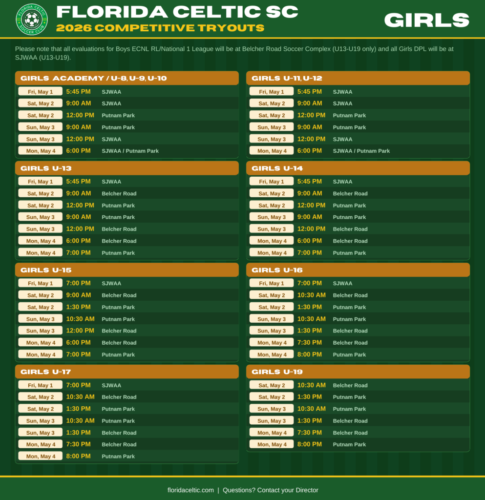 Florida Celtic competitive tryouts will begin on May 1st. For the month of April we will be holding ID Clinics for our Boys ECNL RL and Girls DPL teams. Please attend these early tryouts if you are interested in participating in these leagues. All players must pre-register to participate in tryouts.